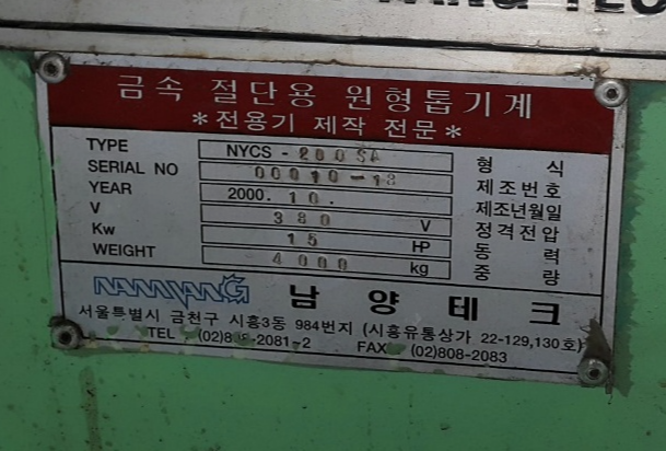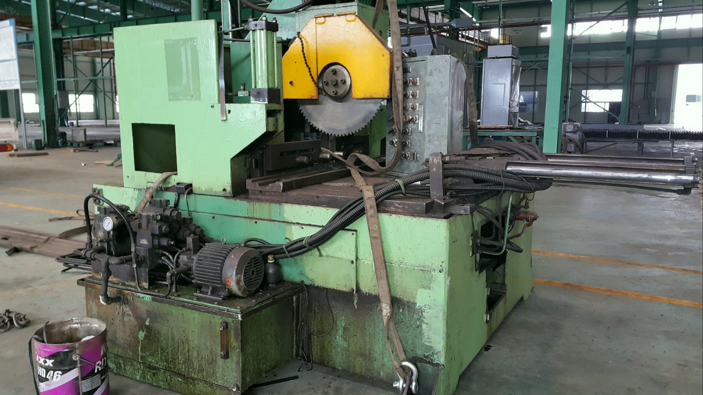 국내 톱기계전문회사인 남양테크사에서 생산된 것으로 4000kg의 대형기계로 위 테이블면에 고정되어 회전하는 톱날이 내려와 절단되는 방식으로 톱에는 블레이드가드가 톱을 덮고 있습니다 설치장소는 넉넉하고 환기가 잘되는곳이 있어야 하며 고속으로 회전하는 톱날은 속도를 조절해 금속의 재질에 따라 선택하여 조작합니다