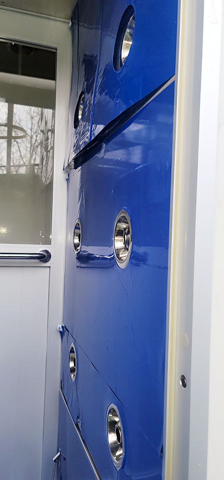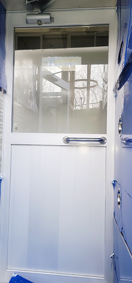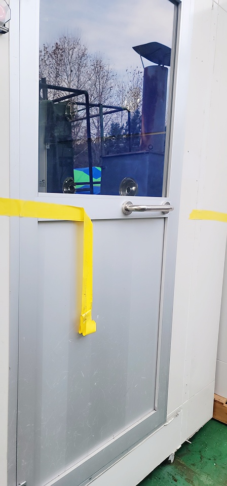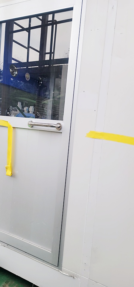 내부에서 보이는 에어샤워기계의 전면도어 입니다 빛반사로 인하여 반대편이 보이나 창문은 매우 잘보이는 상태로서 문을 열고 들어가거나 나갈때 한번쯤 둘러 볼수 있습니다 문을 열면서 미리 대기해있던 다른 작업자와 충돌할 수 작업중에 유심히 살펴보도록 합니다 입구에 설치되어 있습니다