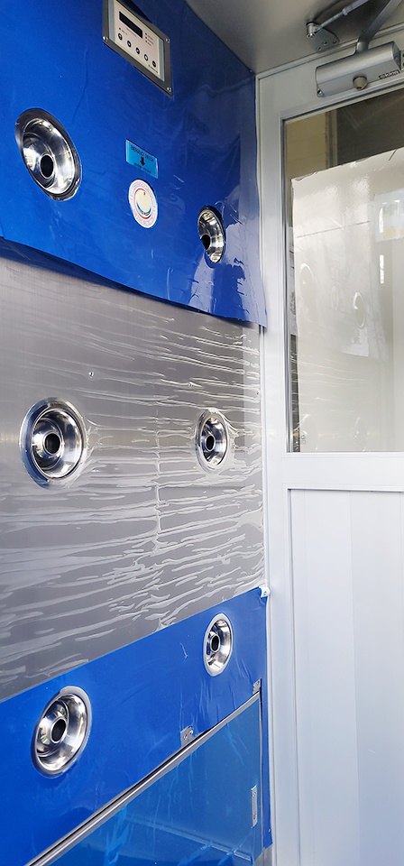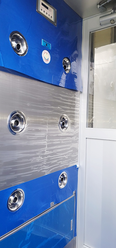 2인용의 사이즈로서 흔하게 이용되고 있는 외관은 청정실을 보호하기 위해서 입구에설치되어 작업자가 들어갈때 반드시 에어샤워기를 통과해야만 작업실로 들어갈 수 있습니다 또한 특수복장인 방진복 방진화 등을 착용하여 추가로 오염도를 낮추는데 기여합니다 추가로 신발 바닥부분은 에어샤워링중에는 서있기 때문에 바닥면과 신발밑부분이 밀착되어 있어오염물질을 제거 하기 어려운데 이에 스티키 매트와 함께 에어샤워 흡입매트를 이용합니다