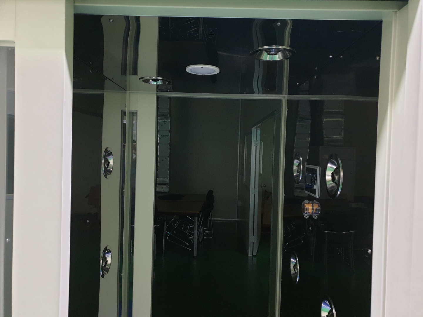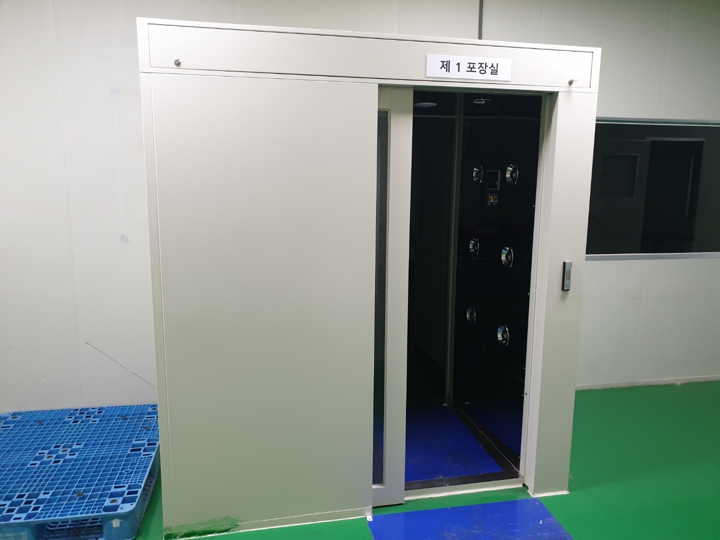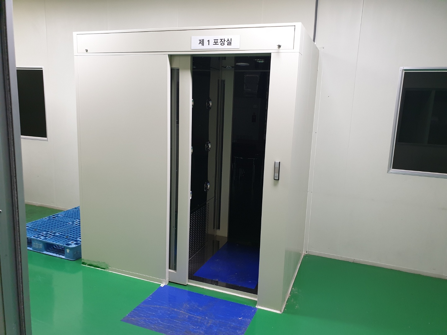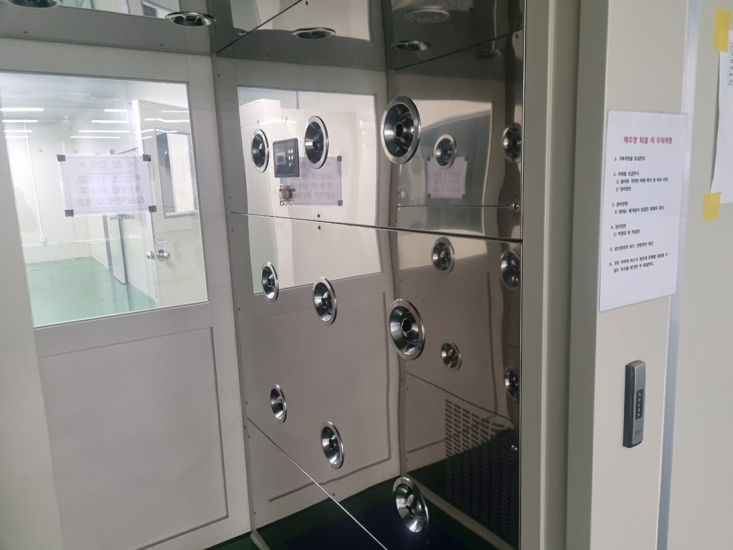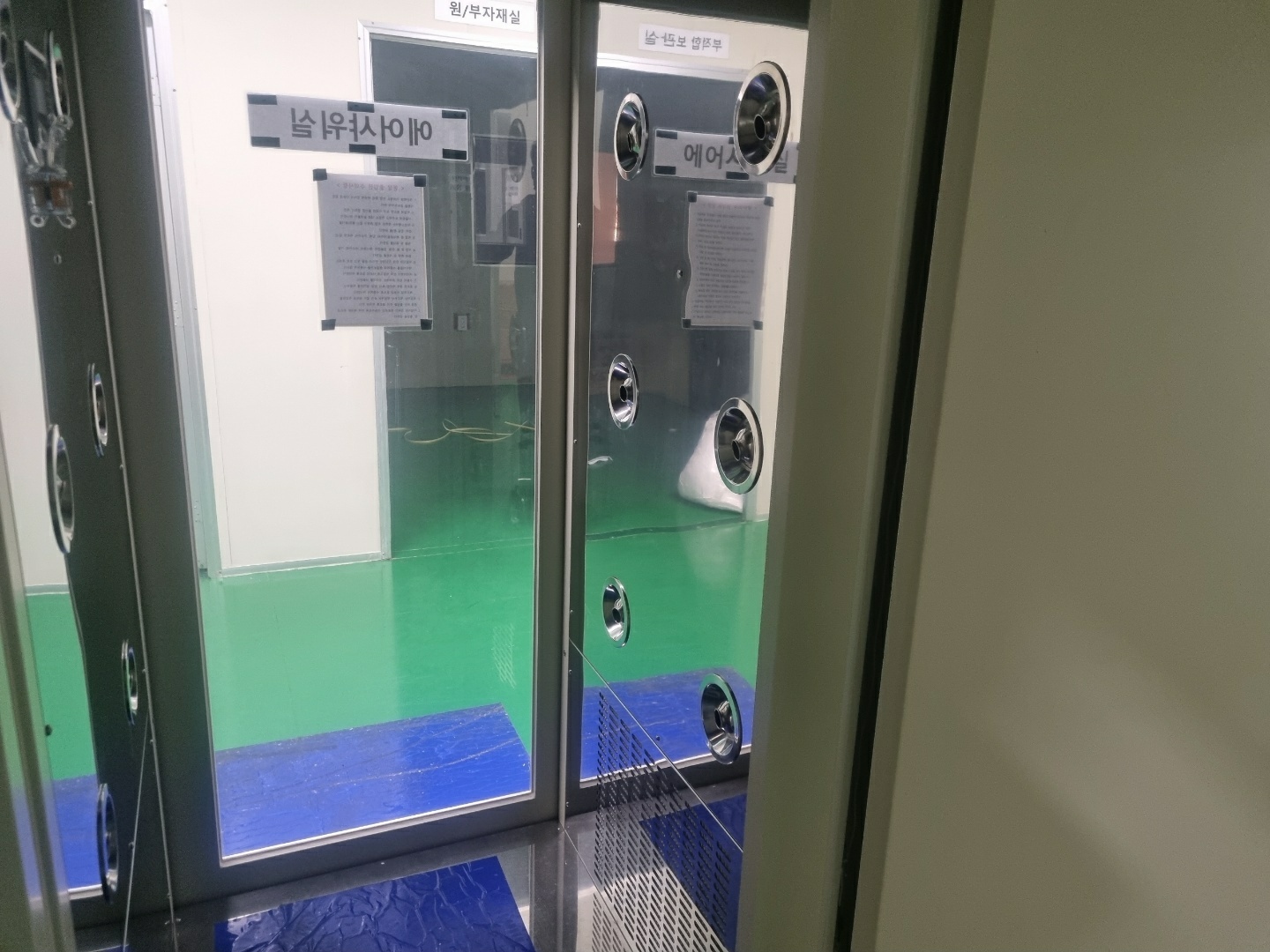 분사가끝나면 외부의 공기유입을 막기위해 클린룸으로만 들어가는 문만 열리게 되며 작업자들은 현장으로 들어가게 됩니다