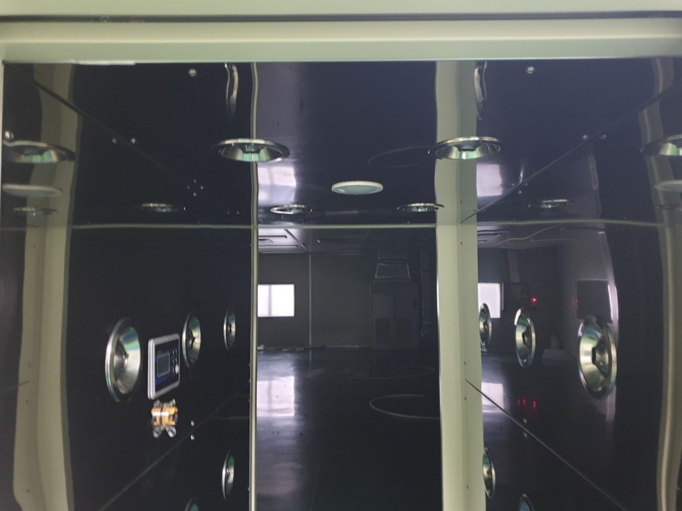 최대 6인이 사용할 수 있으며 물품 반입이 가능한 에어샤워기는 다수가 들어갈 수 있어 대량생산 시에 효율적으로 사용할 수 있으며 벽면은 스텐으로 되어 있어 습기나 염분에 내구성이 강하여 녹이 잘 들이 않습니다
