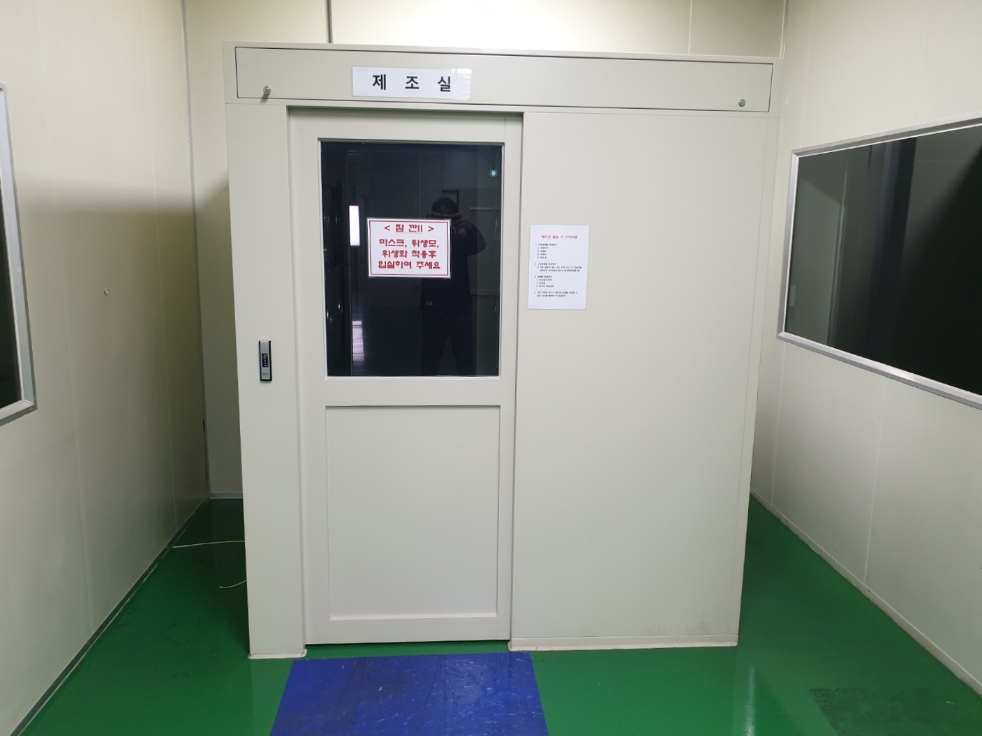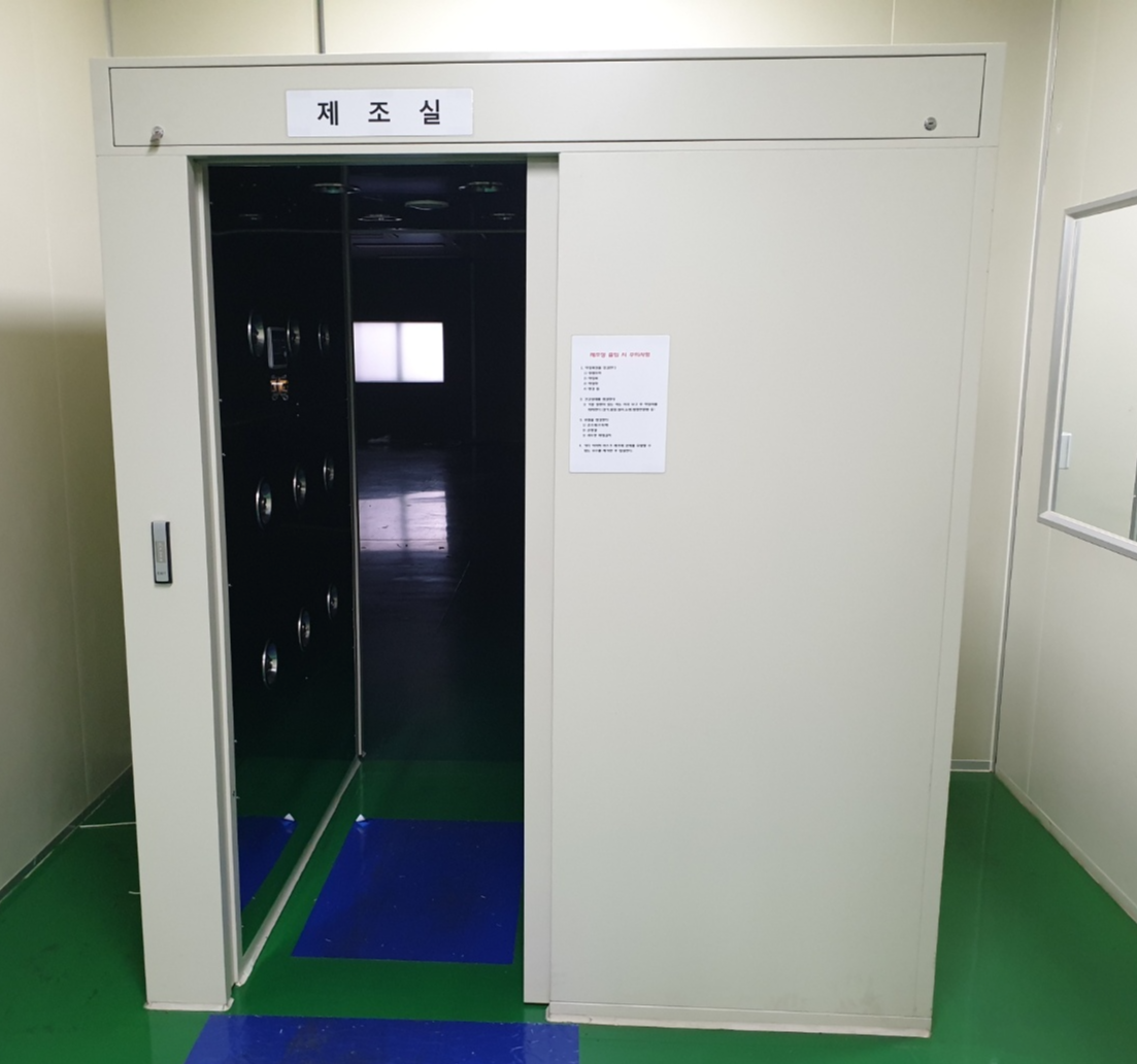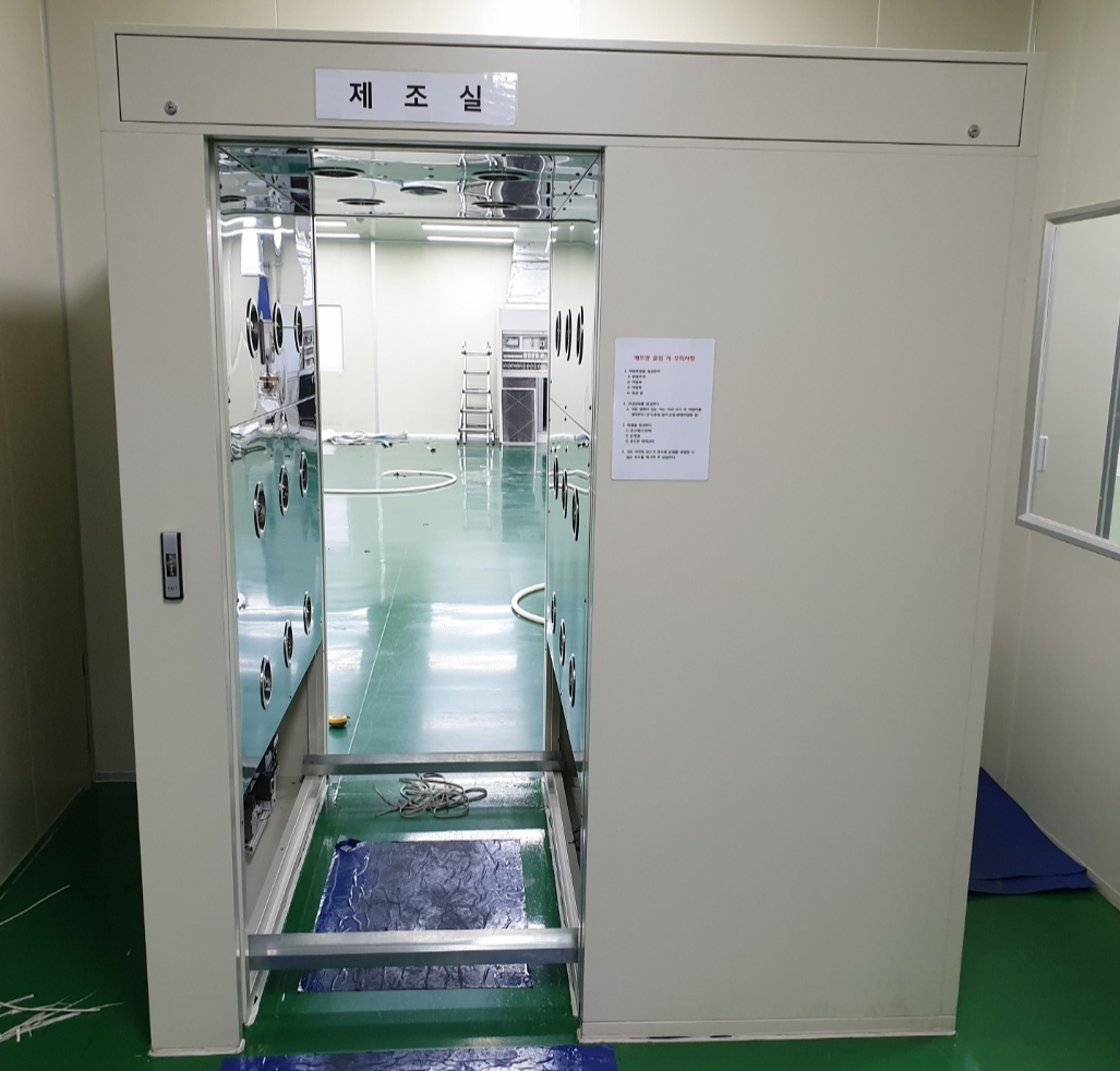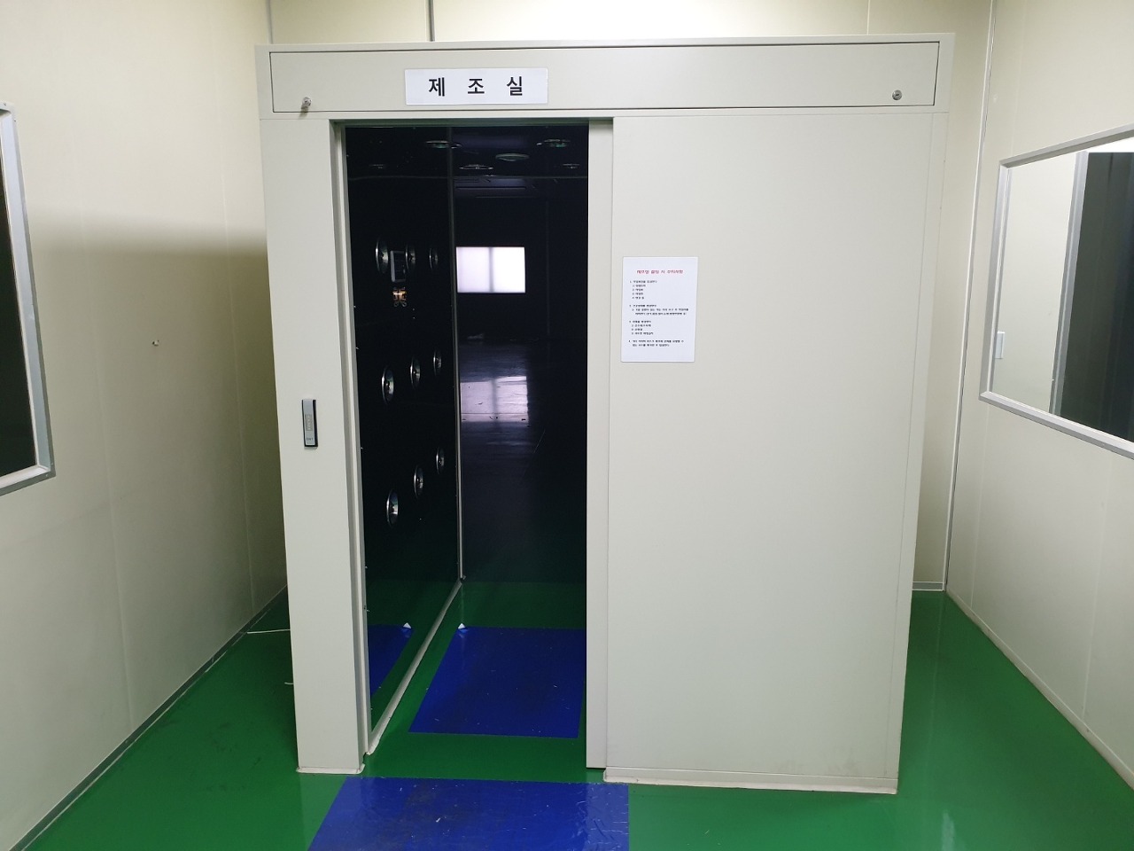 슬라이딩 도어방식으로 수레의 물품을 실어 나르기가 편리하며 도어는 반유리 형태로 내부의 에어샤워의 진행상황을 확인할 수 있어 밖에서 대기 중인 작업자는 끝난 뒤 바로 에어샤워룸으로 들어갈 수 있습니다