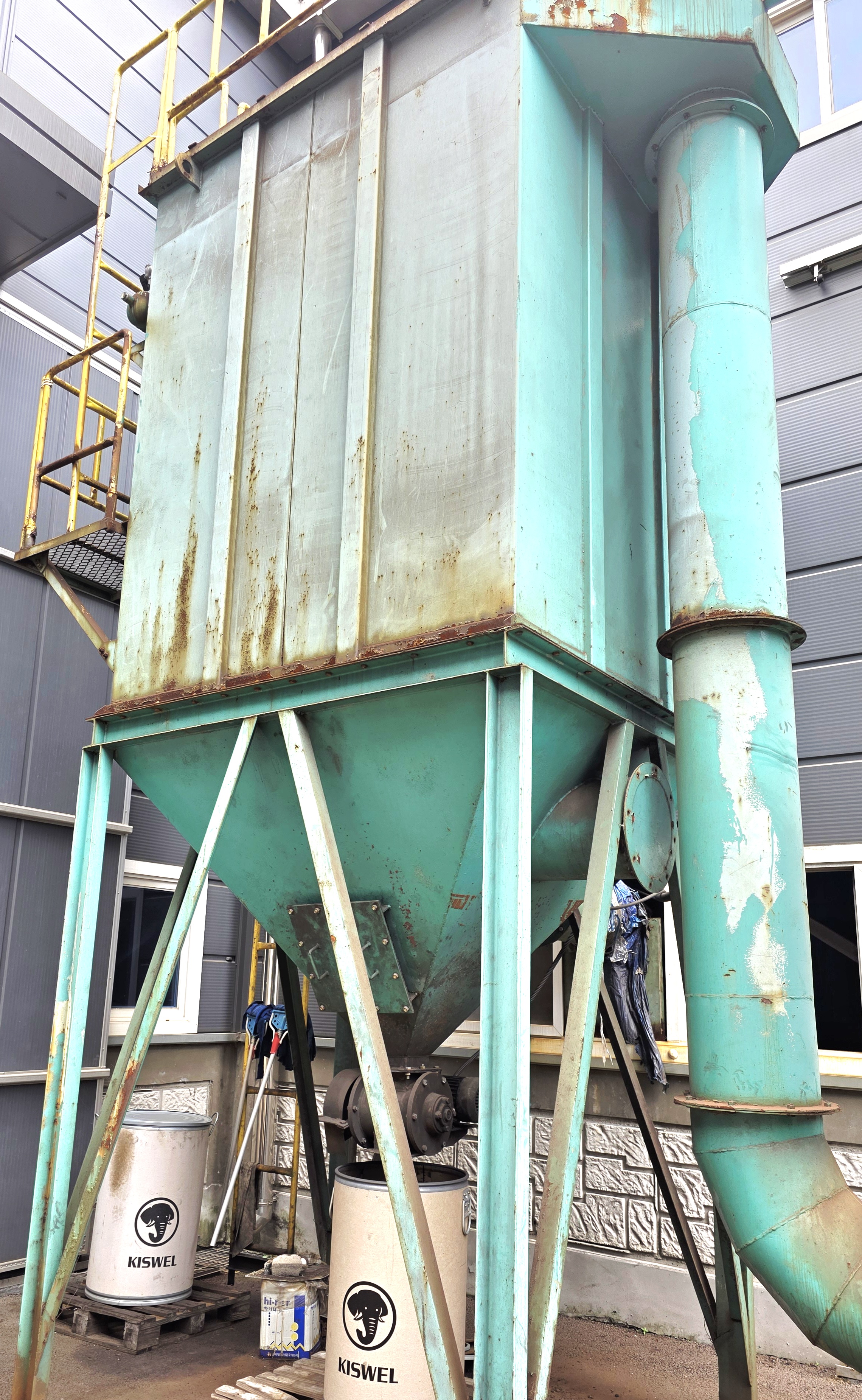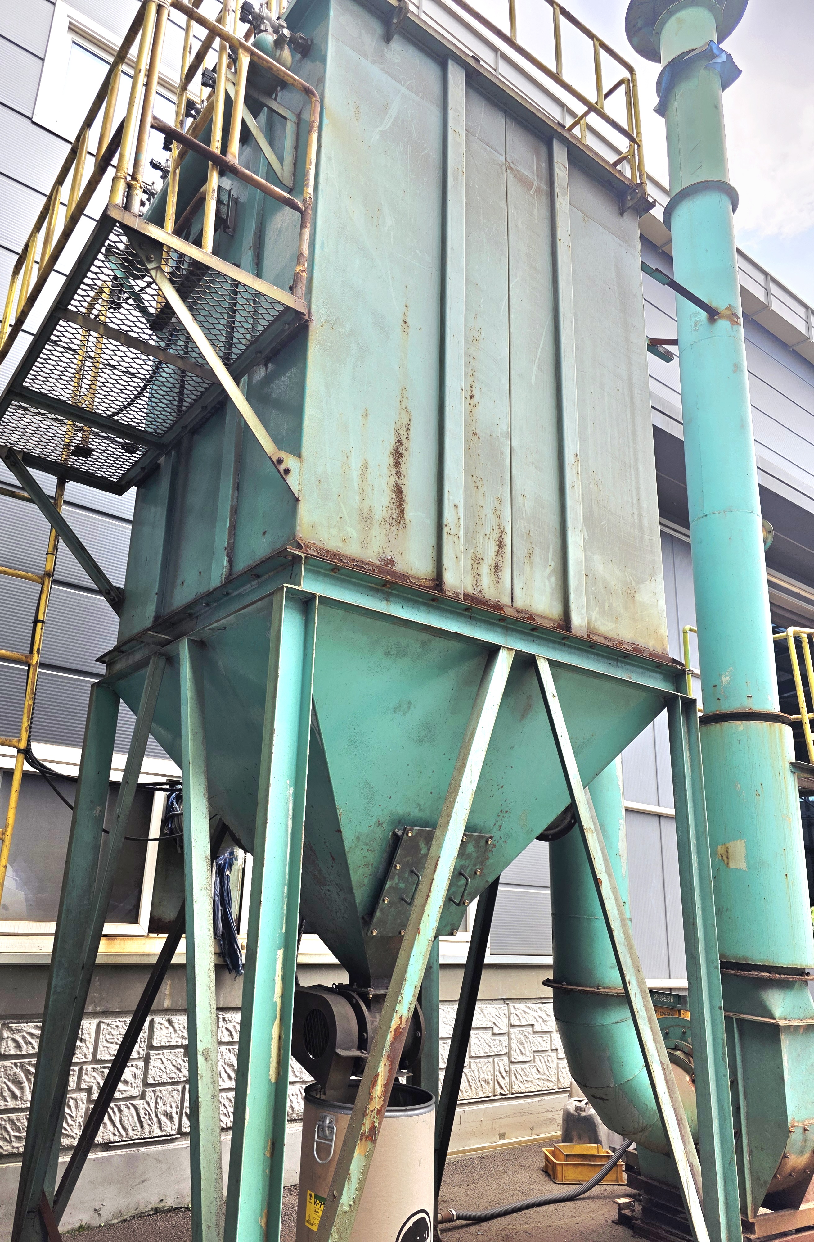 외부에는 별도 설치된 분진 집진기가 연결돼 있습니다. 이 장치는 작업 중 발생하는 분진이나 미세 금속 파편을 하부 드럼통으로 수거하는 구조로 되어 있으며 드럼 내부 상태나 필터 교체 가능 여부에 따라 집진효율이 좌우됩니다. 특히 오래된 집진기는 내부에 슬러지나 파편이 쌓일 수 있어 교체 주기를 미리 파악해 두는 것이 좋습니다.