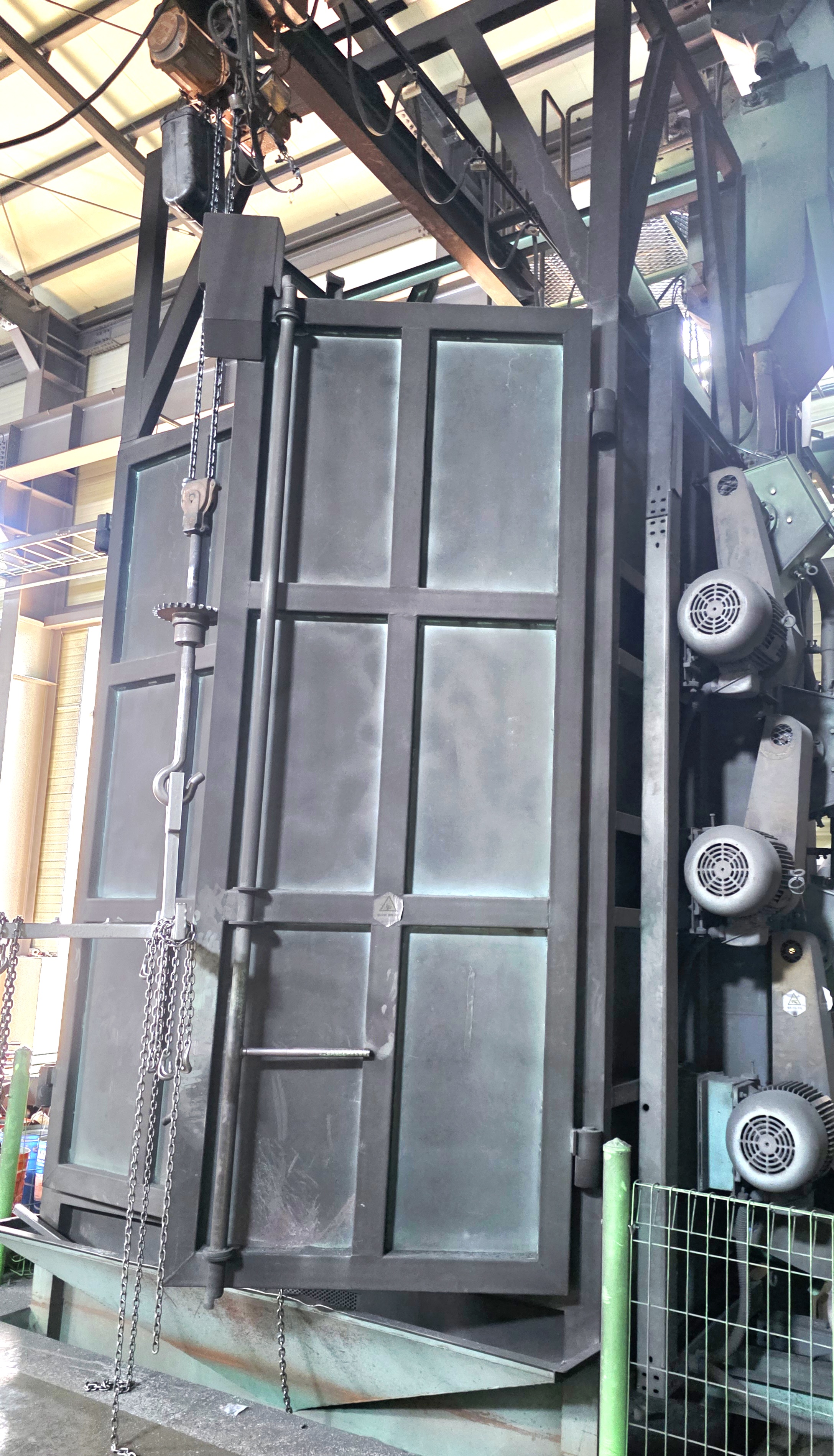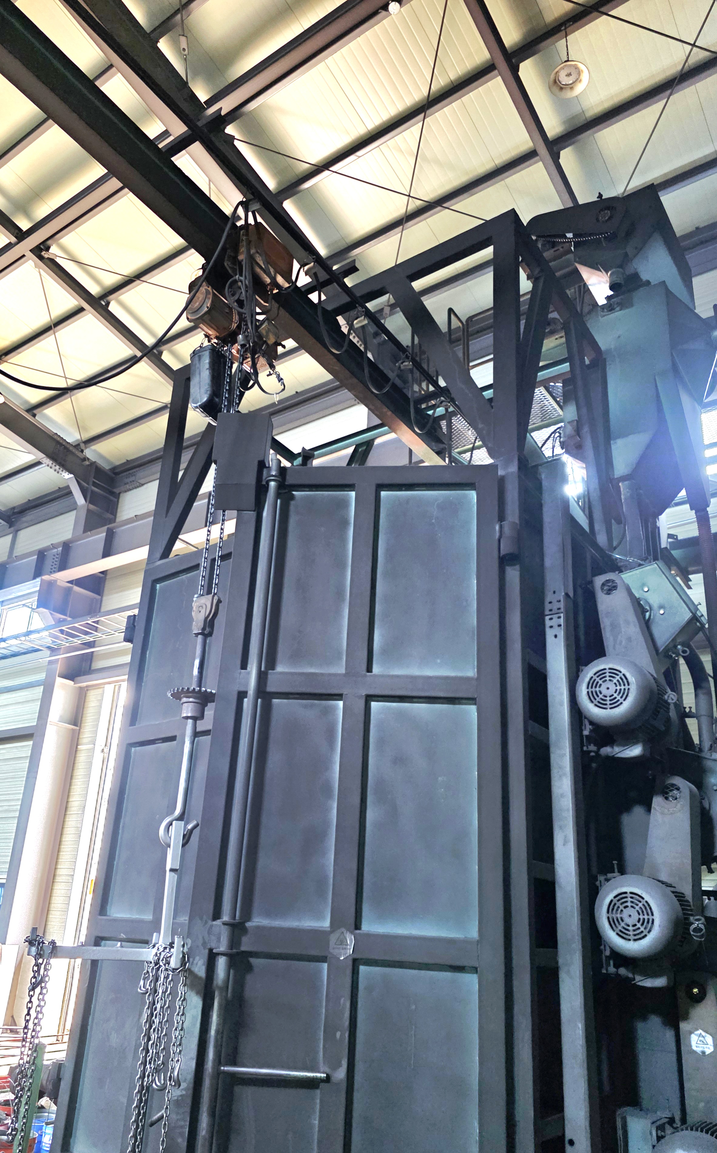 #쇼트블라스트 현장에서 기계를 볼때 어디서부터 봐야 할지 고민해야 합니다 겉으로 보기에 거대한 철문이 잇고 체인이 있는 구조물이 복잡하게 있습니다 하지만 조금 더 가까이서 보면 이 장비가 어떤 원리로 돌아가는지 보이는데 예를 들어 수직방식으로 가공물건을 들어 올리는 구조라던가 내부에 걸리는 고리의 회전 방향 같은 것이 있습니다 #행거쇼트기 는 사진으로 보면 구조가 보입니다.