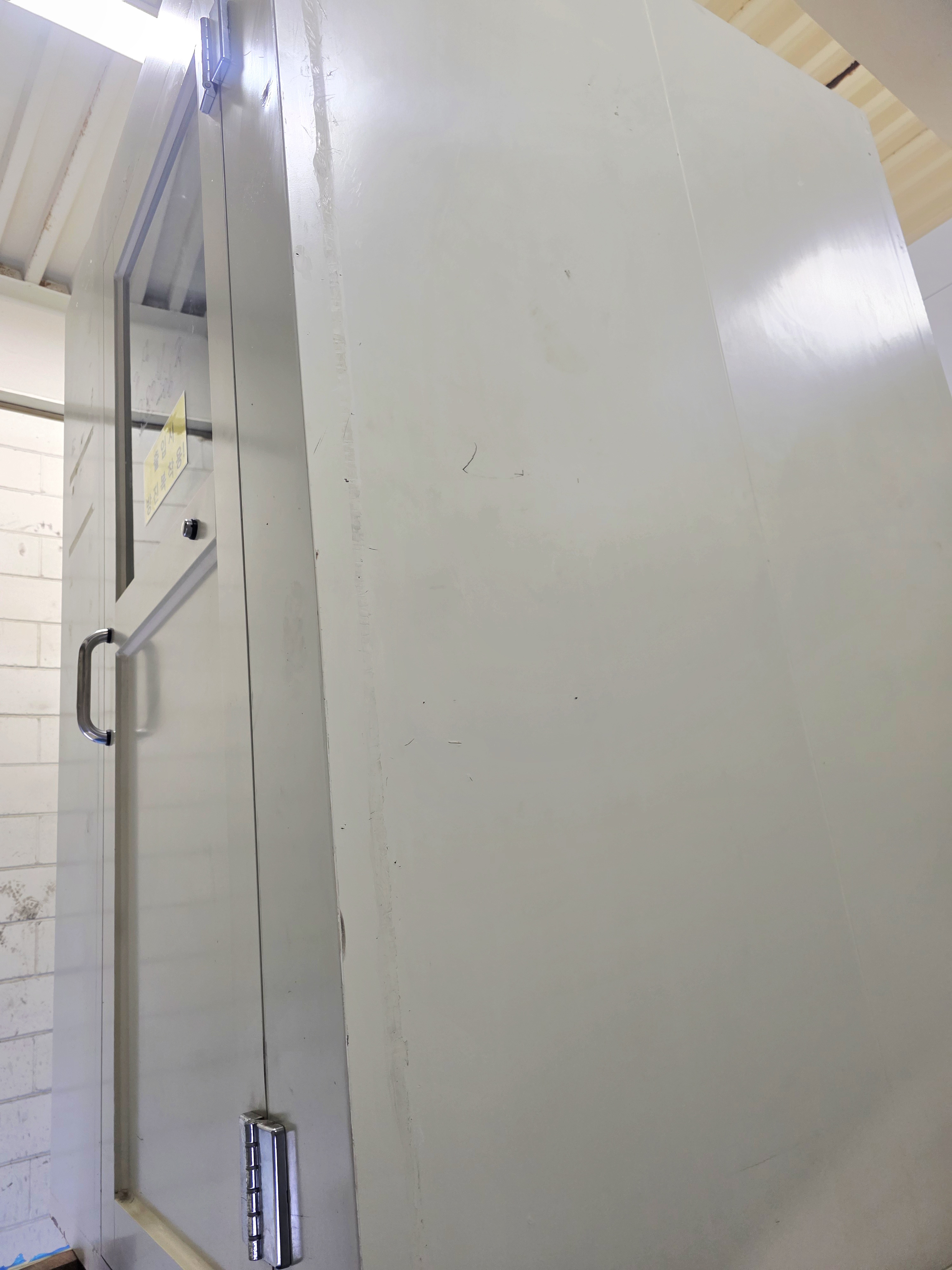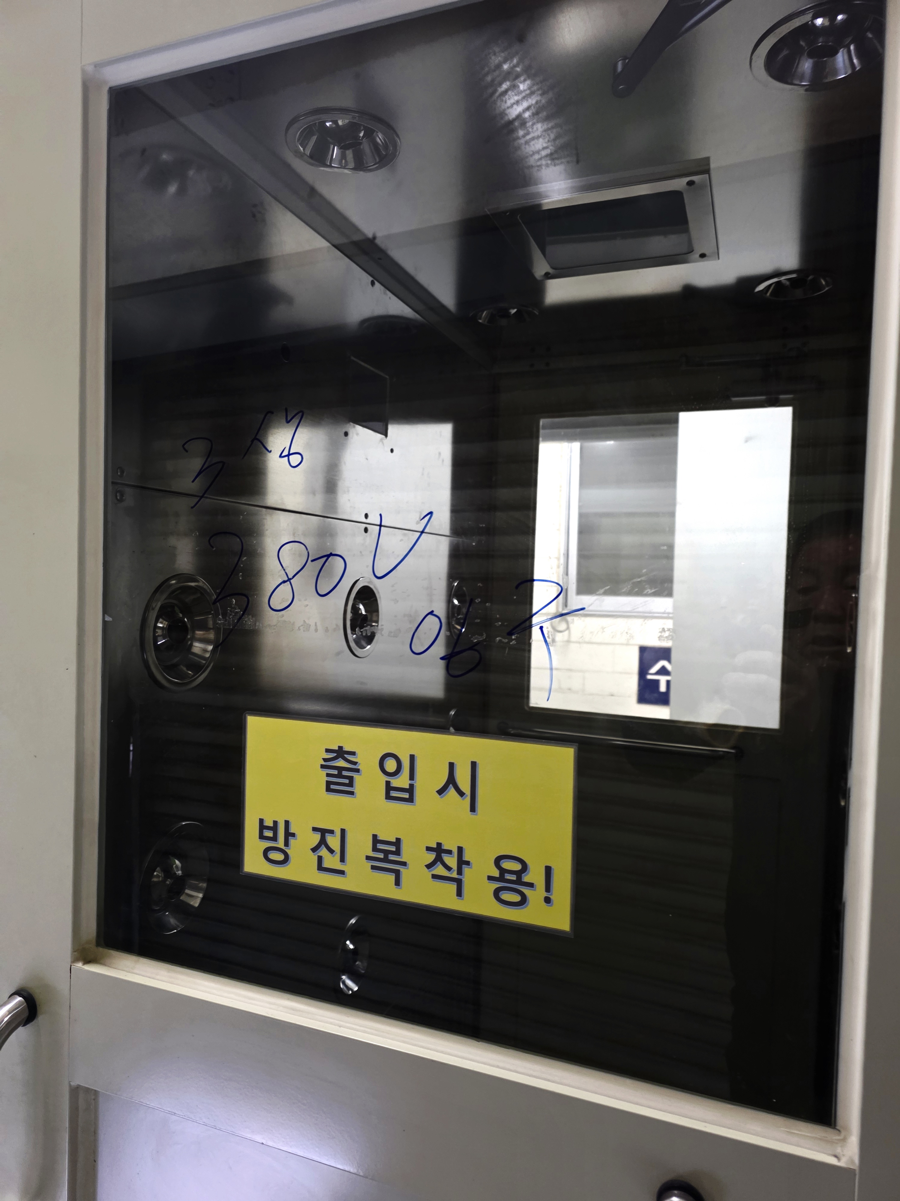 출입 도어에는 관찰창이 적용돼 있어 외부에서 내부 상태를 바로 확인할 수 있다. 관찰창을 통해 벽면 노즐과 천장 일부가 함께 보이기 때문에, 내부 구성과 정렬 상태를 빠르게 점검할 수 있는 구조다. 중고 설비를 확인할 때 별도의 개방 없이 상태를 살펴볼 수 있다는 점은 실무적으로 유용하다.