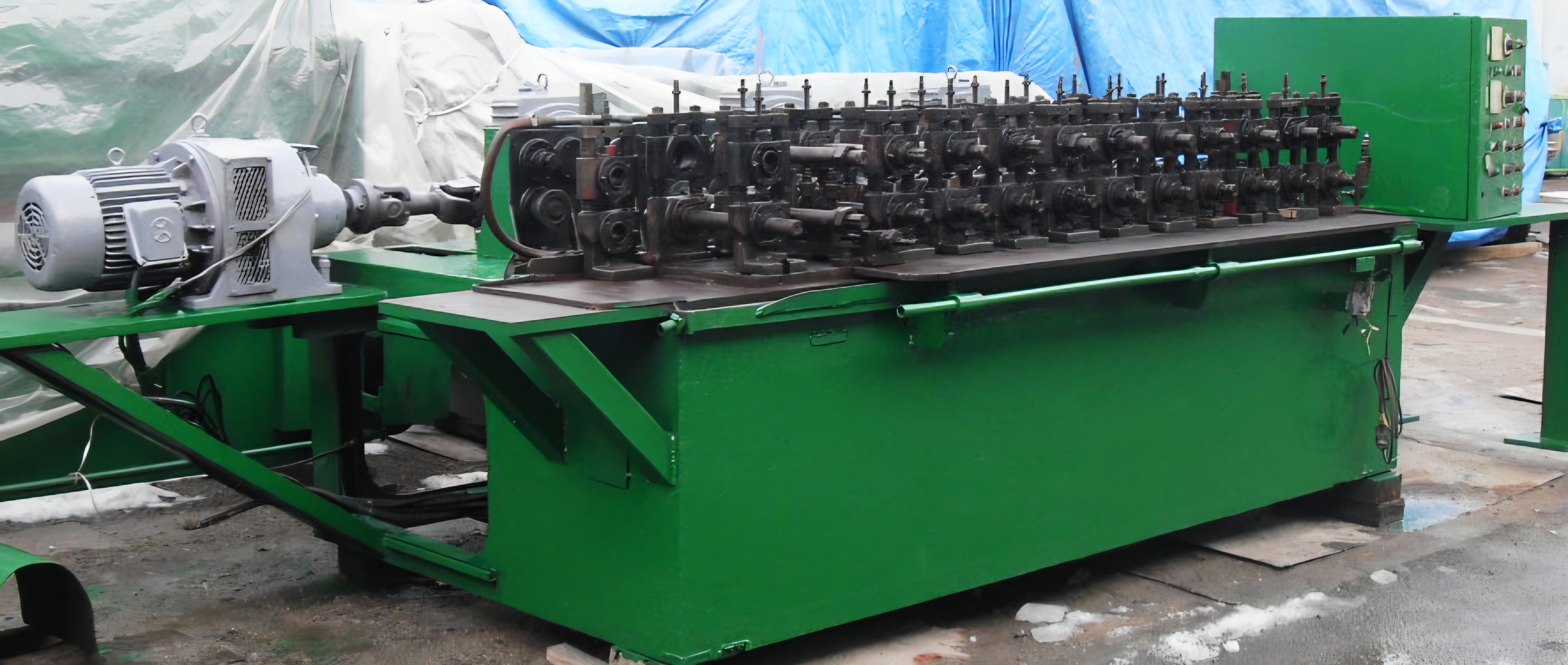 성형부를 따라 롤 샤프트가 장축 형태로 길게 이어진 구조가 확인된다. 장축 롤포밍 라인은 공정이 여러 단계로 분리되어 순차적으로 진행되는 설비에서 주로 사용된다. 이 중고 롤포밍기 역시 단일 스테이션보다는 연속 공정을 전제로 한 라인형 설비로 분류할 수 있으며, 성형부 길이와 배열 상태에서 이러한 특징이 드러난다.