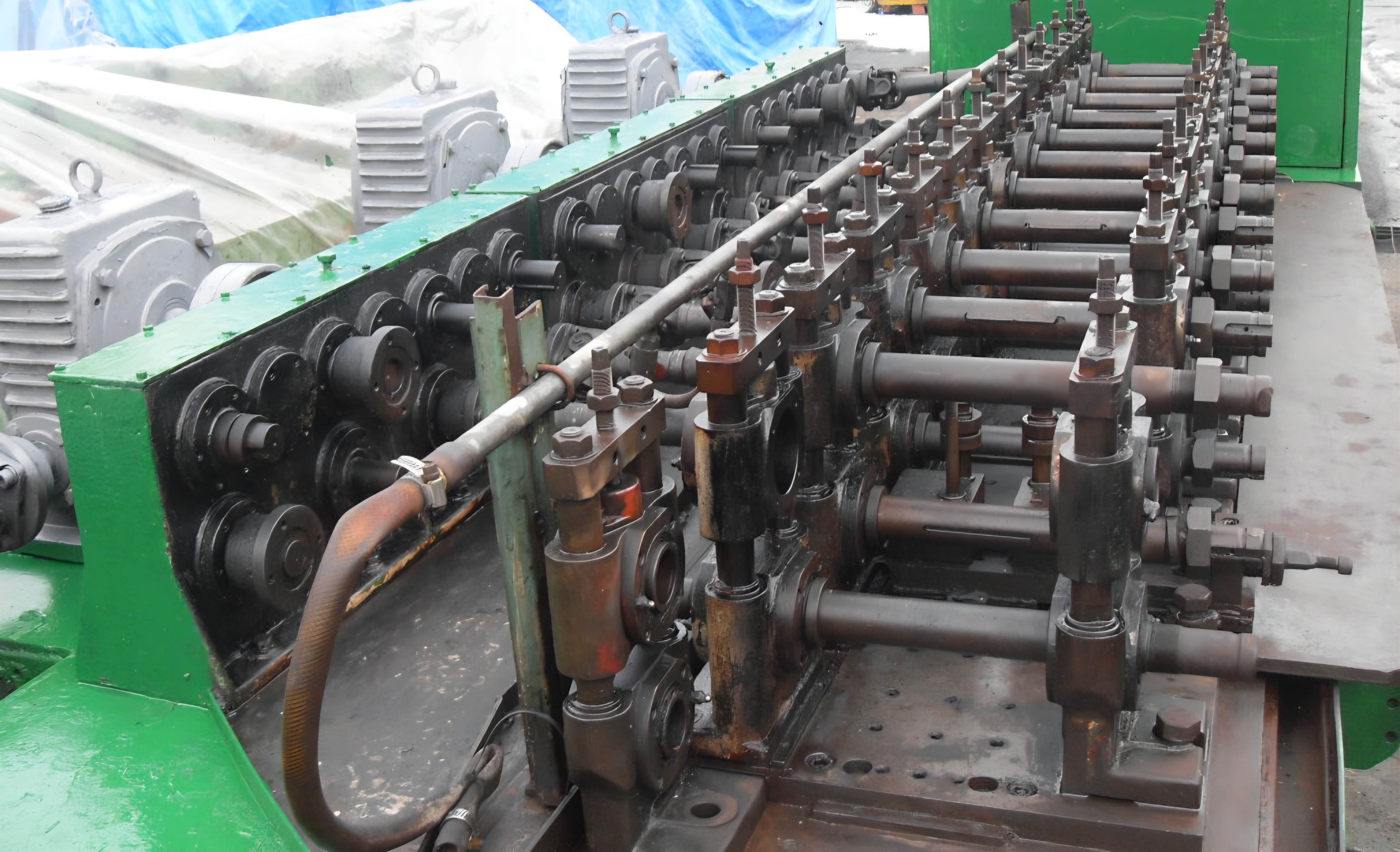 각 스테이션에는 금속 성형을 담당하는 롤 유닛이 반복적으로 배치돼 있다. 롤 유닛은 샤프트를 중심으로 일정 간격을 유지하며 배열되어 있으며, 성형 공정이 단계별로 이어지도록 구성된 형태다. 이러한 금속 성형 롤 유닛 배열은 연속 성형용 롤포밍 설비의 전형적인 구조로, 장비의 용도와 성격을 직접적으로 보여준다.