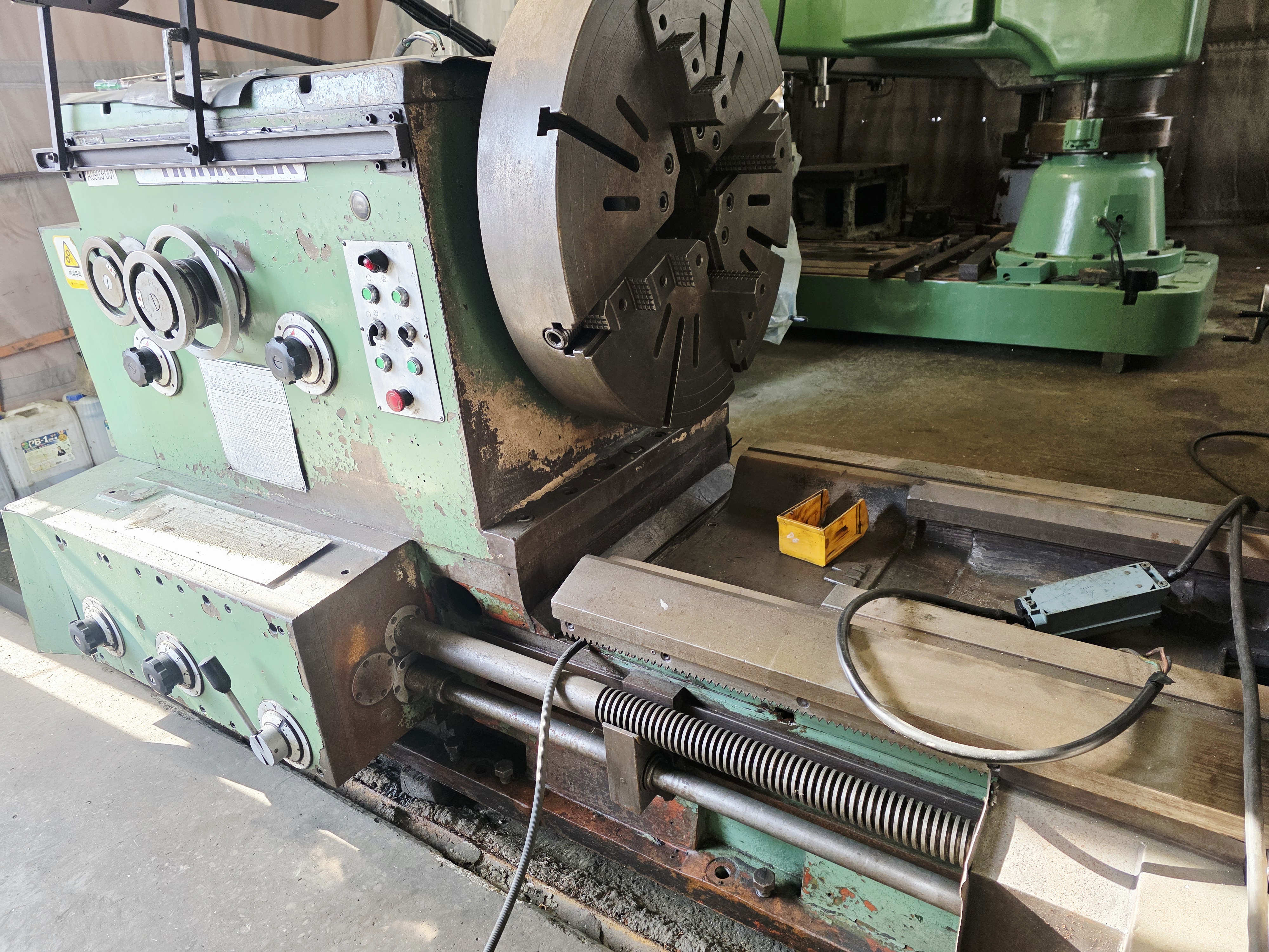 한국공작 기계의 가장 큰 자산은 진동을 잡아주는 묵직한 주물 바디에 있습니다. 전체 전경을 보면 강력절삭형 사양에 맞게 하부 프레임이 견고하게 설계되어 고하중 작업 시에도 뛰어난 안정성을 보장합니다. 외관상 큰 파손이나 변형 없이 원형을 잘 유지하고 있어 장축 가공 시 뒤틀림 없는 정밀도를 기대할 수 있습니다.