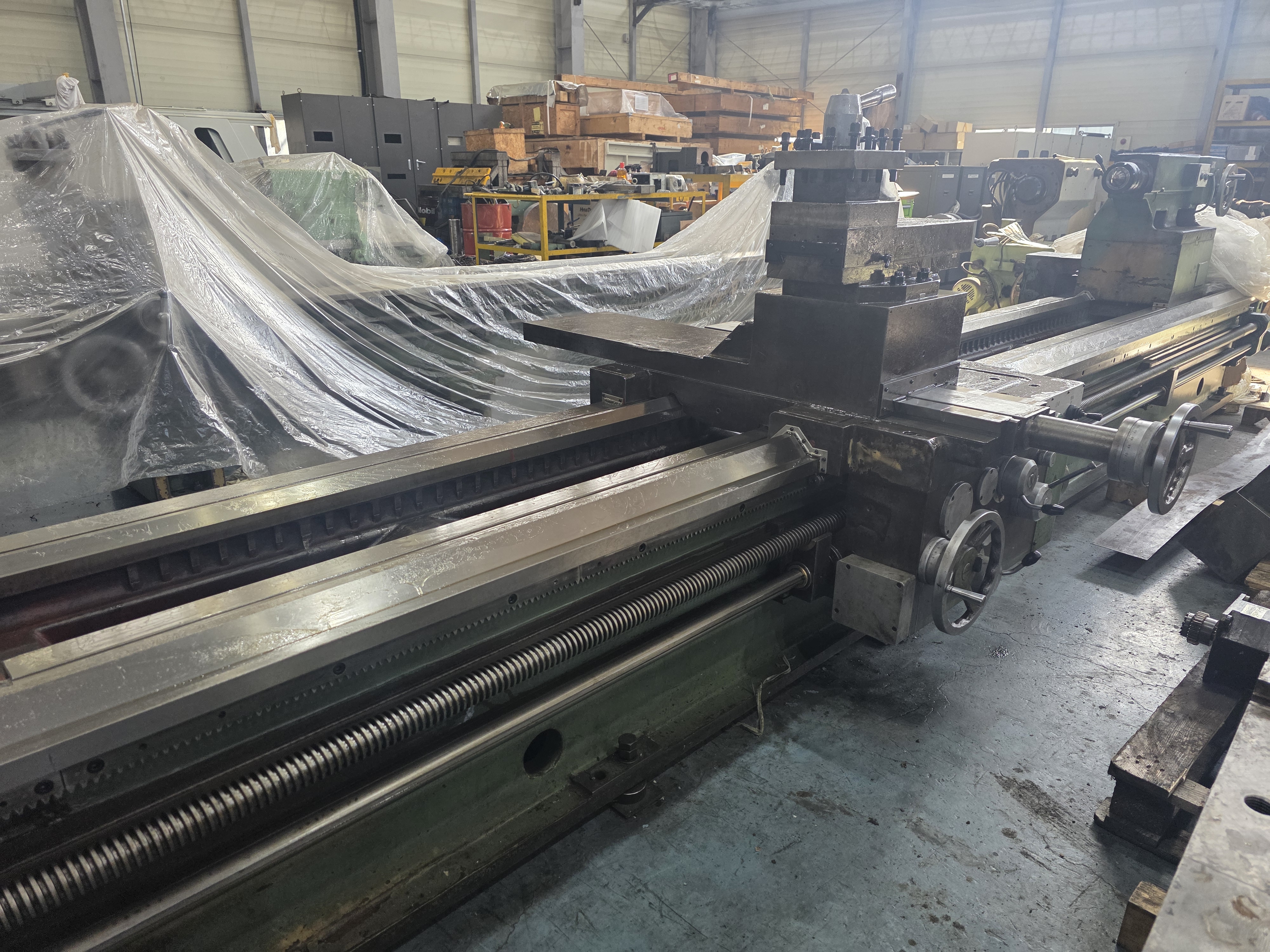 5,000mm에 달하는 긴 구간의 이송을 담당하는 리드스크류와 피드 로드의 정렬 상태입니다. 사진상 휨이나 마모 없이 직선도가 양호하게 유지되고 있어 나사 가공 및 자동 이송 시 일정한 품질을 기대할 수 있습니다. 긴 베드 전 구간에 걸쳐 이송 저항이 일정하게 유지되어 가공 오차를 최소화할 수 있는 컨디션입니다.