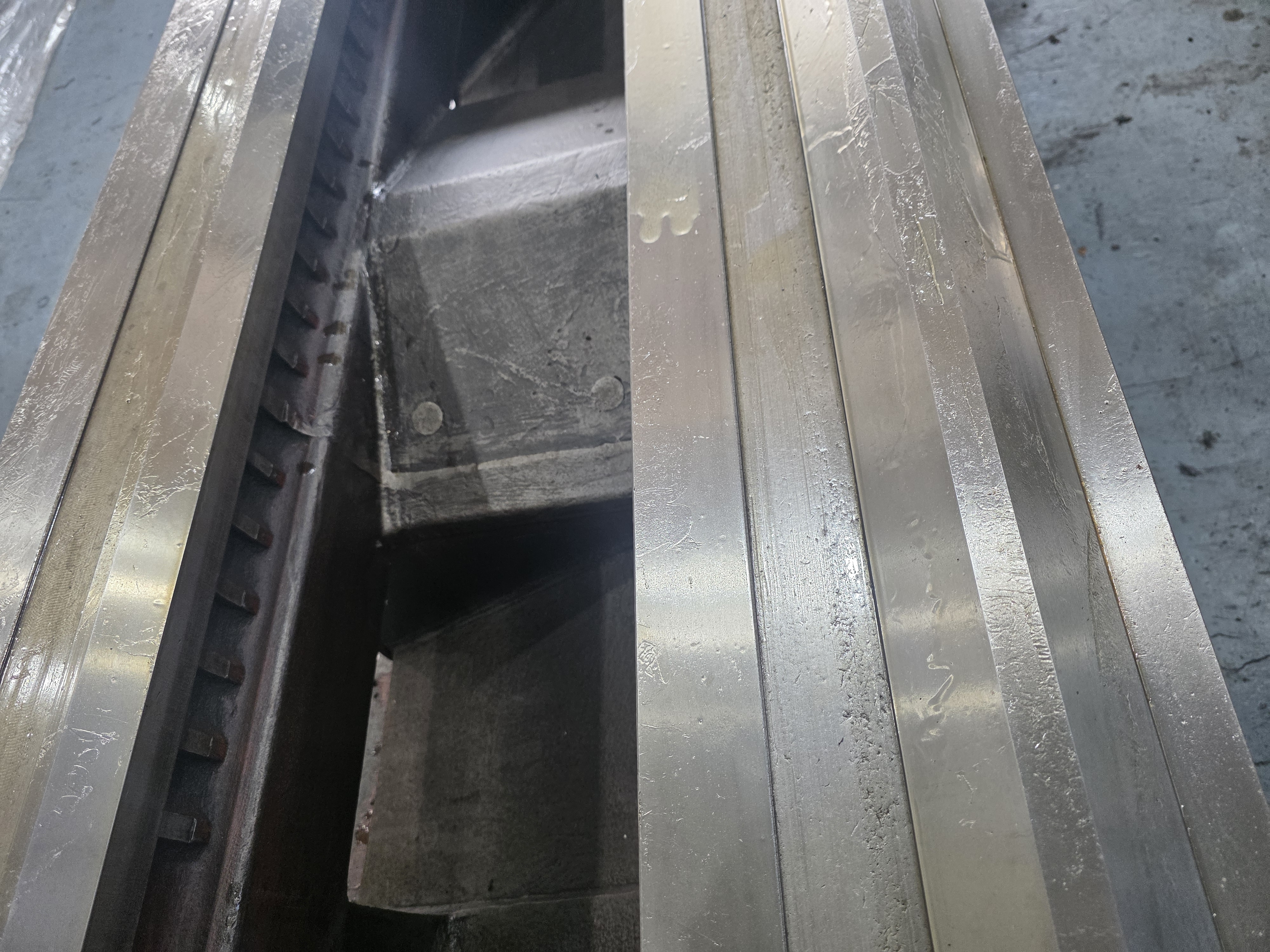 장베드 선반의 정밀도를 결정하는 가이드웨이의 근접 상태입니다. 광폭 평면 베드 구조를 채택하여 고하중 공작물 적재 시에도 압력을 고르게 분산하여, 사진상으로 확인되는 습동면의 마모 상태를 매우 양호합니다. 특수 열처리된 베드 표면은 높은 경도를 유지하고 있어 칩에 의한 스크래치 발생을 억제하여 장기적인 정밀도 유지에 유리합니다.