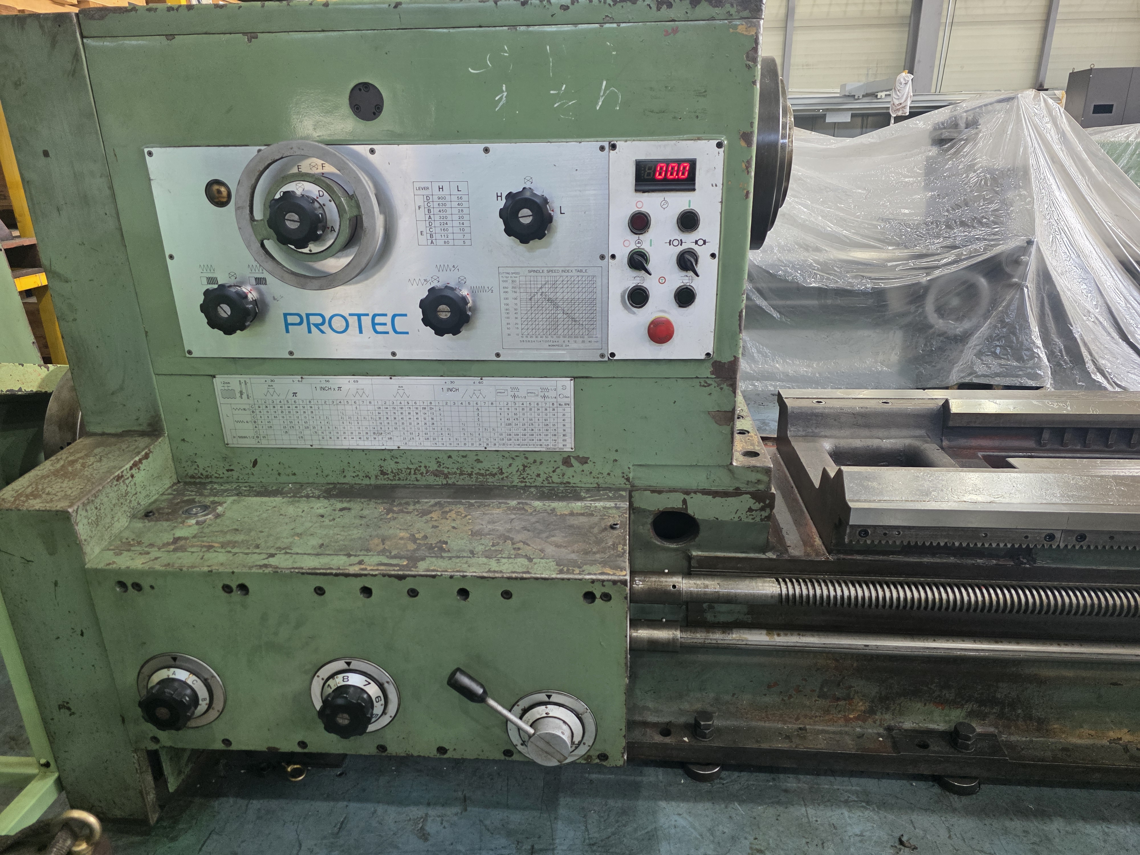 PROTEC 11 모델 고유의 견고한 주축대 구조를 확인할 수 있습니다. 강력한 토크 전달을 위해 내부 기어류의 배치가 최적화되어 있어 대형 작업 시에도 안정적인 출력을 보장합니다. 제조사의 정식 명판이 보존되어 있어 장비의 정체성과 사양을 명확히 확인할 수 있는 신뢰도 있는 장비 입니다.