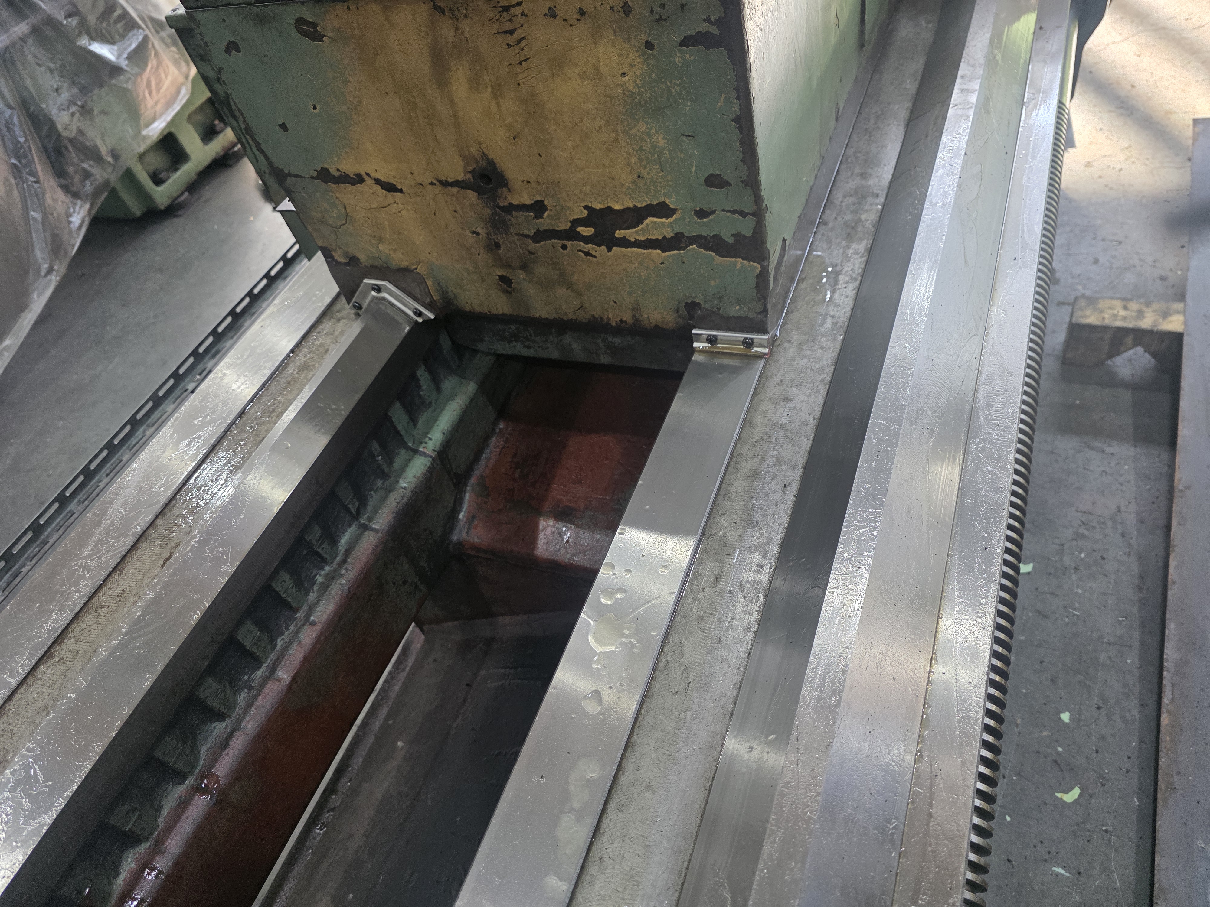 기계 수명과 직결되는 습동면 오일막 형성 상태입니다. 자동 급유 시스템을 통해 상시 윤활이 이루어지고 있어 금속 간의 직접적인 마찰과 부식을 효과적으로 방지하고 있습니다. 베드 보호를 위한 와이퍼 상태도 양호하여 가공 칩이 습동면으로 유입되는 것을 원활하게 차단하고 있습니다.