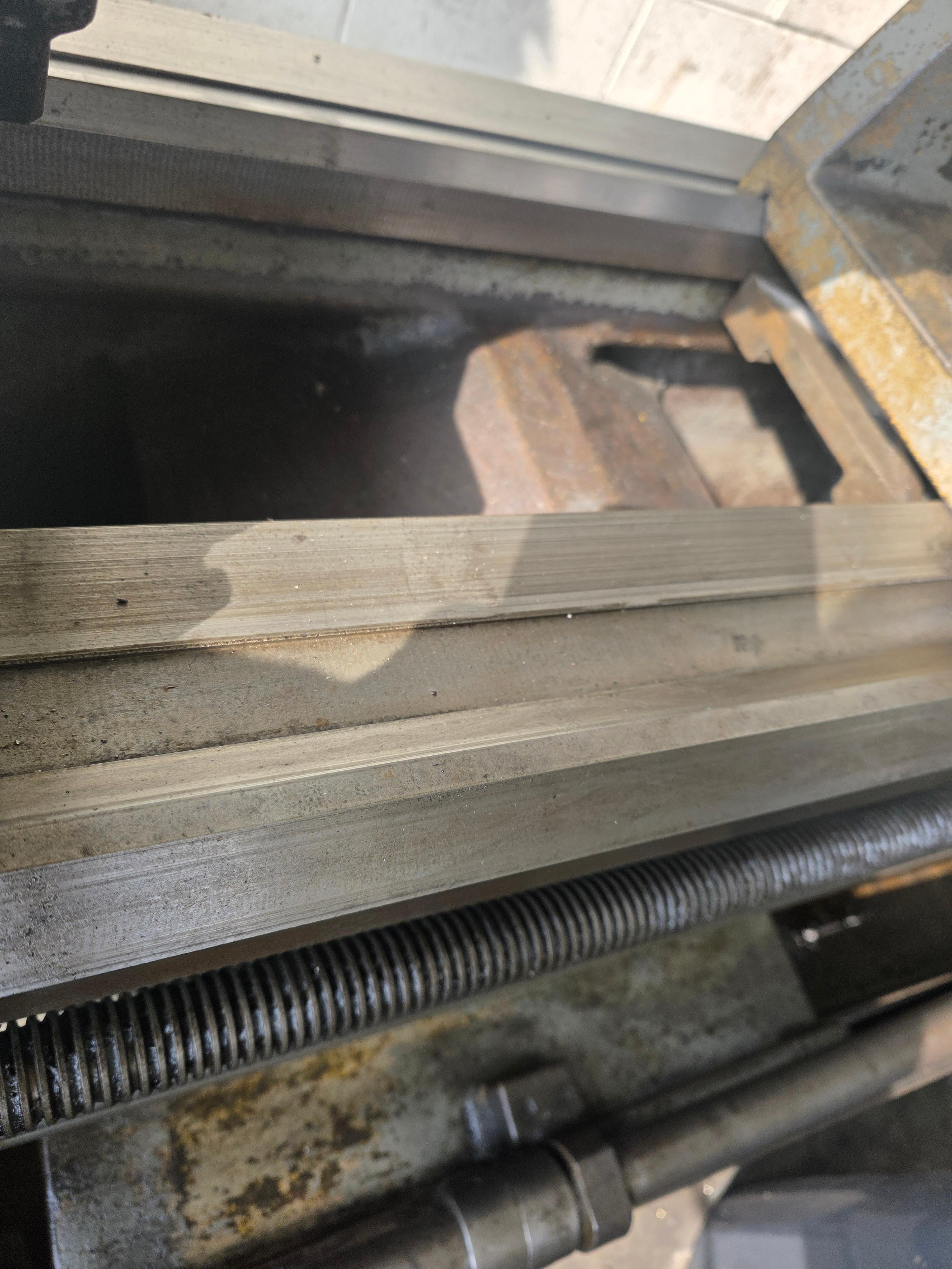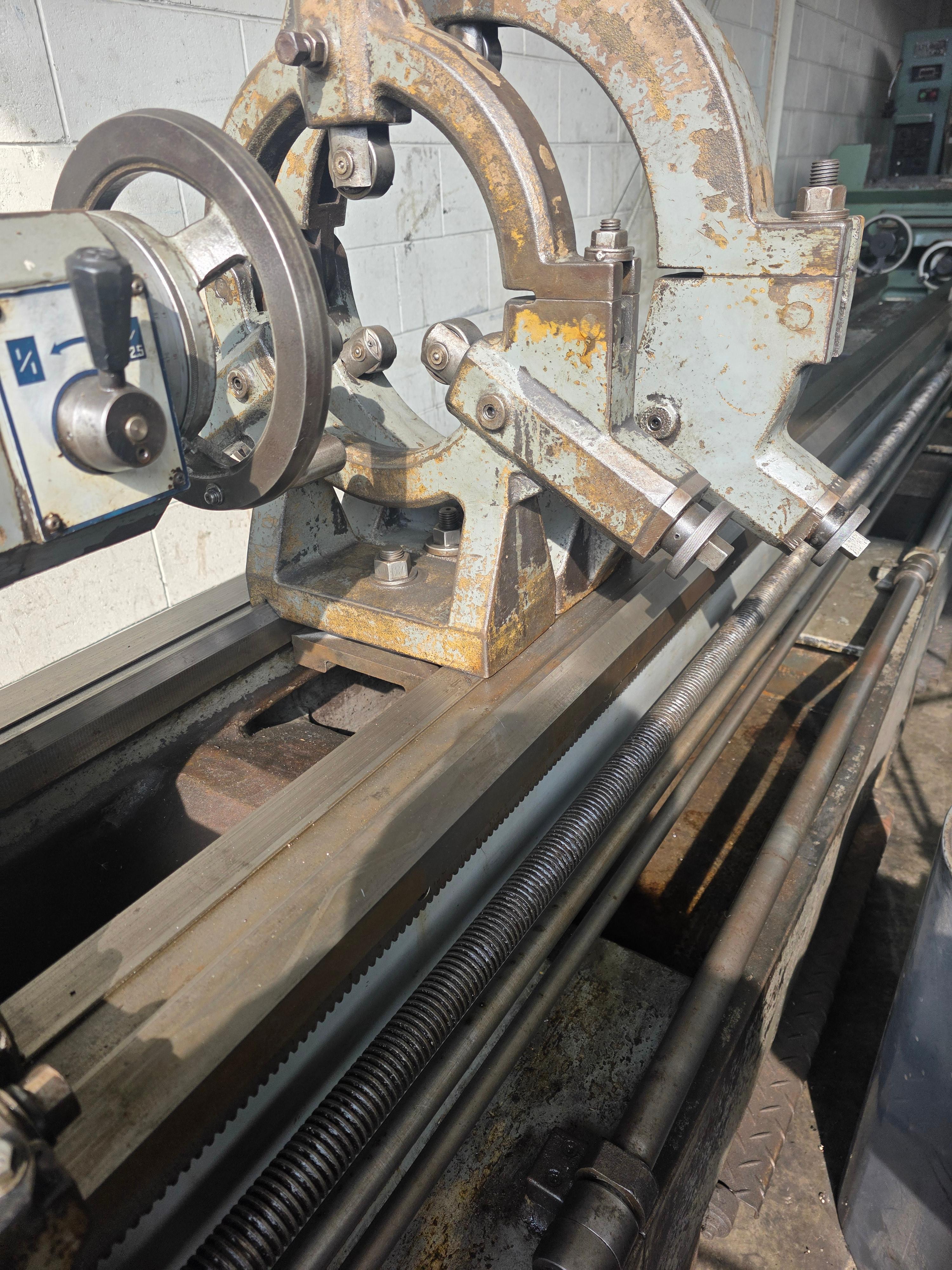 기계 하부의 핵심 구동축을 살펴보면, 정밀한 피치 구현을 위한 리드스크류와 자동 이송 샤프트가 노출형 구조로 설계되어 있습니다. 오랜 사용감에도 불구하고 나사산의 건전성이 양호하며, 수동 이송 시 핸들의 유격이 적어 숙련된 작업자가 미세한 치수 보정을 수행하기에 최적의 상태를 유지하고 있습니다.
