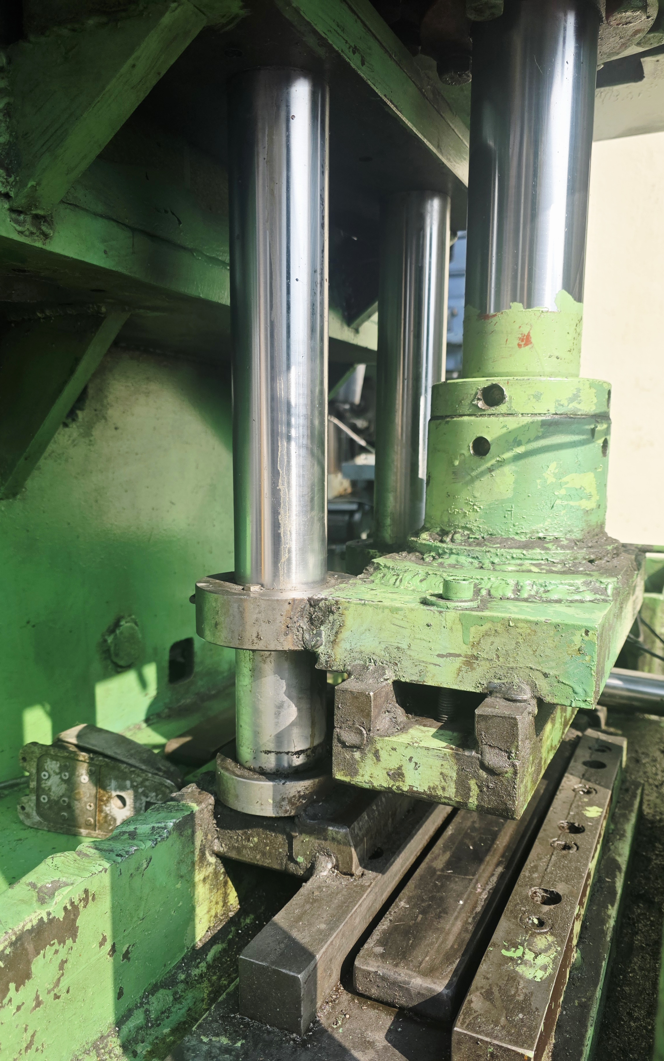 본 장비는 4개의 가이드 컬럼이 슬라이딩 블록의 수직 정렬을 유지하는 구조이며, 이는 편하중 발생 시에도 금형의 평행도를 유지하는 데 결정적인 역할을 합니다. 특히 가이드봉 표면에 적용된 고경도 크롬도금은 반복적인 스트로크 과정에서 발생하는 마찰열과 부식을 방지하며, 실린더 실(SEAL)의 마모를 최소화하여 시스템의 기밀성을 장기간 보존합니다. 표면 거칠기가 정밀하게 관리된 가이드 시스템은 슬라이딩 소음을 줄이고 작동 유압의 급격한 상승을 방지하여 에너지 효율 측면에서도 유리합니다.