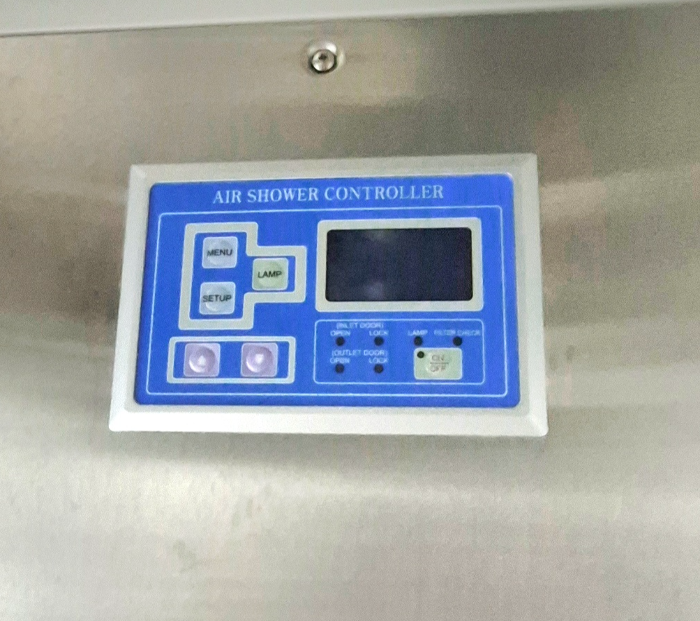 기계 외부 상단에 위치한 에어샤워 제어 패널은 장비의 모든 가동 프로세스를 관리합니다. 이 모델에 탑재된 컨트롤러에는 도어의 잠금 및 개방 상태를 시각적으로 전달하는 인디케이터가 포함되어 잇습니다 .인디케이터는 입축구 도어의 인터락 상태를 작업자에게 즉각적으로 알림으로써, 강제 개방으로 인한 시스템 고장을 방지하고 클린룸 내부로의 외부 공기 유입을 물리적으로 차단하는 신호 역할을 수행합니다.