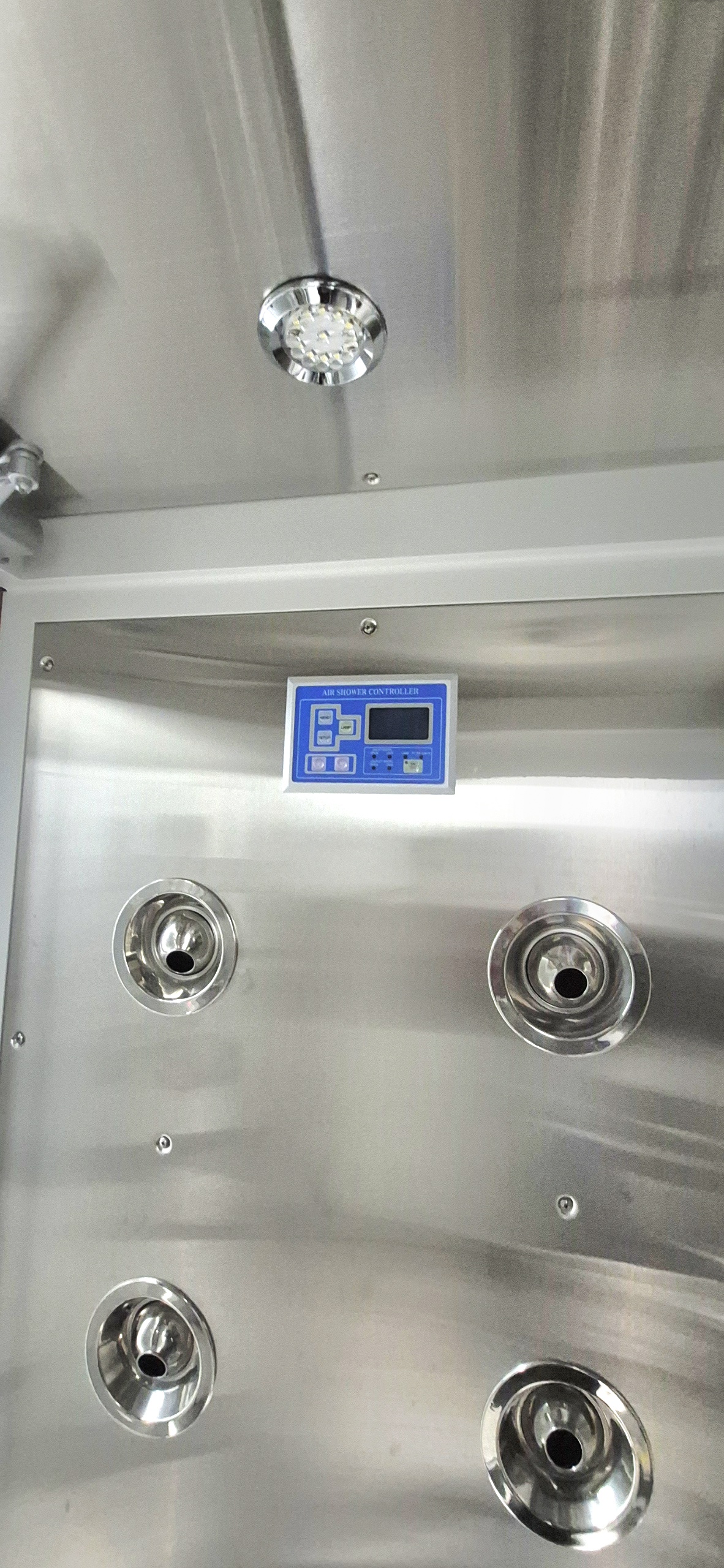 에어샤워 챔버 상단부에는 송풍 팬과 전력 제어 모듈이 있습니다. 내부에 매립된 고휘도 LED 조명은 에너지 효율이 높으면서도 작업자의 시야를 충분히 확보해 줍니다. 상부 유닛은 유지보수가 용이하도록 설계되었으며, 디지털 제어 패널과 연동되어 분사 시간 및 센서 감도 등을 정밀하게 조정할 수 있는 안정적인 제어 환경을 제공합니다.