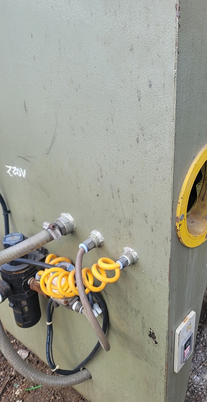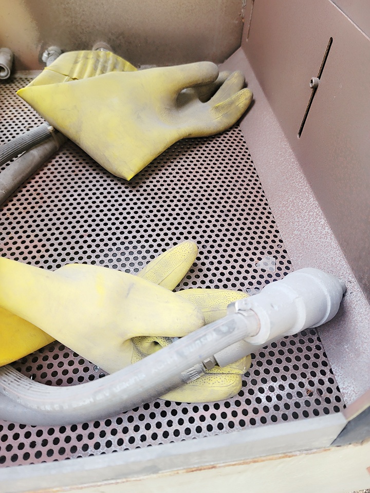 내부에 연결된 장갑과 에어건의 사진이며 하단에는 작업 후에 발생한 잔여물들이 밑으로 빠지도록 되어 있습니다