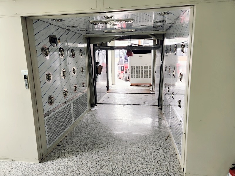 길이 2미터의 화물용에어샤워기계는 꺠끗한상태로 되어 있으며 내부는 스테인리스 스틸소재로 되어 있습니다 노즐은 방향을 조절하여 원하는 방향으로 분사할 수 있습니다